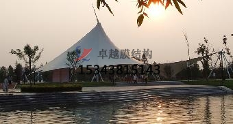 盡管上述四種基本形式的造型各不相同,但都遵循一個原則,即要通過剛性支承構(gòu)件或連接件在膜面內(nèi)形成一系列的高點和低點;這正是互反曲面的基本特征,即互反曲面的邊界不會位于同一平面內(nèi)。把握了這一原則,在實際設(shè)計中就可以根據(jù)支承構(gòu)件的形式(桅桿、拱或吊環(huán))及其對膜的支承方式(點支承或線支承),來選取適當(dāng)?shù)纳虡I(yè)廣場雨棚搭建造型形式。