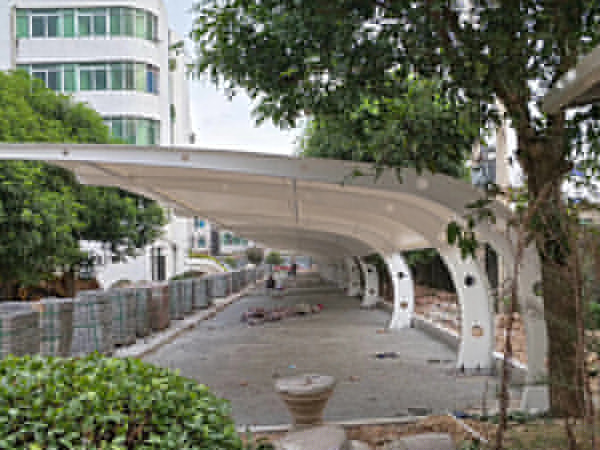 3、膜結(jié)構停車棚頂部封板采用茶色(顏色可挑選)陽光板封頂,與車棚整體骨架用壓條鉚接固定,耐酸堿腐蝕,有足夠強度對棚內(nèi)車輛起到保護作用。
