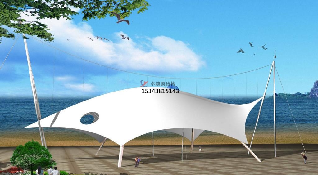 以膜材、鋼索及支柱構(gòu)成,利用鋼索與支柱在膜材中導(dǎo)入張力以達(dá)安 定的形式。除了可實踐具創(chuàng)意,創(chuàng)新且美觀的造型外,也是比較能展現(xiàn)膜結(jié) 構(gòu)精神的構(gòu)造形式。 大型跨距空間也多采用以鋼索與壓縮材構(gòu)成鋼索網(wǎng)來支撐上部膜材的形式。因施工精度要求]高,結(jié)構(gòu)性能強(qiáng),且具豐 富的表現(xiàn)力,所以造價略高于骨架式景觀膜結(jié)構(gòu)遮陽棚。