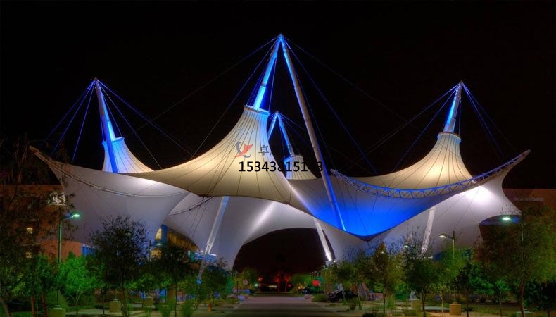 張拉膜景觀動力松弛法從空間和時間兩方面將結構體系離散化。膜結構的動力松馳法在空間上的離散化是將結構體系離散為單元和結點,并假定其質(zhì)量集中于結點上。如果在結點上施加激振力,結點將產(chǎn)生振動,由于阻尼的存在,振動將逐步減弱,更終達到靜力平衡。時間上的離散化,正是針對結點的振動過程而言的。具體點說,先將初始狀態(tài)的結點速度和位移設置為零,在激振力作用下,結點開始振動,跟蹤體系的動能,當體系的動能達到極值時,將結點速度設置為零;跟蹤過程從這個幾何重新開始,直到不平衡力為極小,達到新的平衡。
