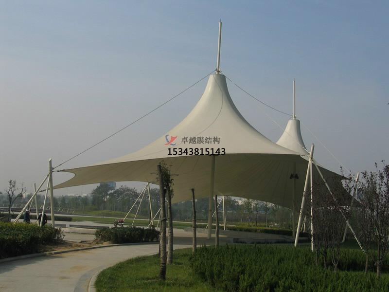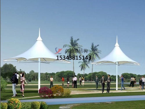 2、預(yù)應(yīng)力施加間隔每次施加預(yù)應(yīng)力間隔24h。第2,3次施加了預(yù)應(yīng)力之時(shí),各處工作點(diǎn)位的人員時(shí)刻觀察膜面的張緊度,遇有應(yīng)力集中的狀況時(shí),應(yīng)當(dāng)及時(shí)進(jìn)行調(diào)整,規(guī)避膜面破壞。張拉完景觀膜結(jié)構(gòu)遮陽(yáng)棚的膜單元后,再安裝焊接蓋口膜。