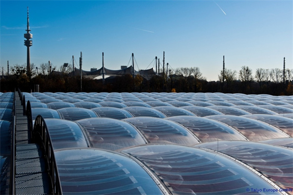 卓越的透光性 – ETFE薄膜可以高度透明,并允許紫外線通過,紫外線負責促進光合作用,從而促進植物生長。太陽能控制/遮陽 – ETFE薄膜系統(tǒng)可在一層或多層上加入多種玻璃料圖案,以改變其太陽能性能。箔片印有各種標準或定制圖案。顏色可以通過各種方式引入,無論它是在薄膜擠出過程中應(yīng)用,提供從紅色到紫色的各種色調(diào)的一致色調(diào),或添加無限顏色選項的照明。彈性 – 雖然ETFE薄膜非常有彈性,但它們?nèi)跃哂薪Y(jié)構(gòu)抗性。彈性/塑性極限的拉伸強度為21-23N /mm 2,但斷裂點的拉伸強度為52/Nmm 2。對于膜結(jié)構(gòu)計算,通常保守地采用15 N /mm的極限。持久耐用 – 長期暴露于環(huán)境污染,紫外線,刺激性化學品或極端溫度變化,ETFE不會降解。聲學 – ETFE薄膜具有大約70%的聲學傳輸可持續(xù)/節(jié)能 – 從薄膜的擠出到運輸?shù)浆F(xiàn)場,與其他類似的包覆材料相比,消耗的能量很少,從而減少了整體碳足跡。除此之外,產(chǎn)品的性質(zhì)通過隔熱和采光增強了建筑物理,從而有助于建筑的全球低能耗。成本效益 – 由于ETFE的輕質(zhì)特性,可以更有效地設(shè)計下部結(jié)構(gòu)支撐系統(tǒng)和混凝土基礎(chǔ)。ETFE系統(tǒng)還提供充足的自然采光,從而通過降低對室內(nèi)照明的需求來更小化能源成本。可回收 – 易于回收利用,來自制造過程的廢棄物甚至舊的ETFE元件可以重新制成新的ETFE產(chǎn)品,如管道部件,電線或鑄件。