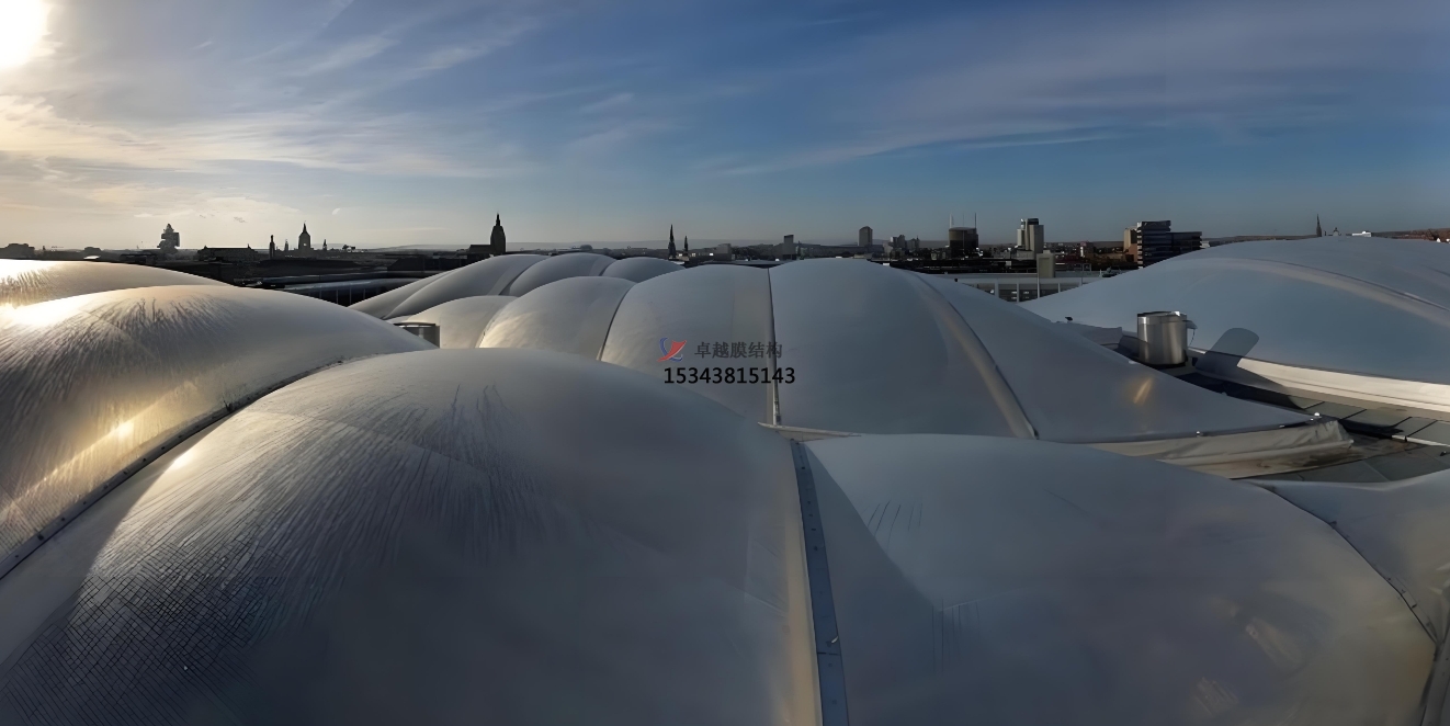 它們都需要采用專門的鋁合金支架進(jìn)行支撐固定,并且根據(jù)一定規(guī)律分割成膜單元。單層ETFE膜外觀造型比較簡單,看起來和玻璃相近;雙(多)層氣枕膜需要使用專業(yè)的充氣系統(tǒng)進(jìn)行智能充氣,保持膜氣枕鼓起,從而獲得立體的氣泡美感和良好的保溫隔熱性能。
