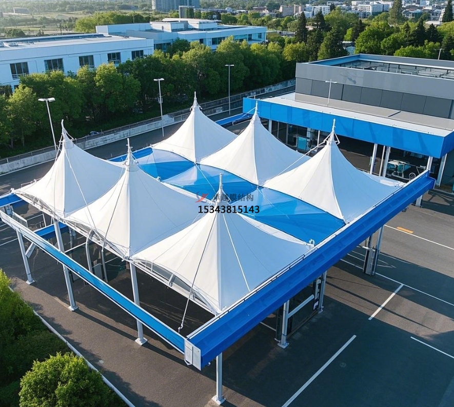 后期維護成本:膜結構雨棚維護成本極低。膜材自潔性能使雨棚表面不易積垢,一般每年僅需 1 - 2 次簡單清潔檢查即可保持外觀整潔。同時,膜材與支撐結構耐久性好,正常使用下很少損壞,降低維修成本。反觀傳統(tǒng)結構雨棚,需定期進行油漆保養(yǎng)、結構檢測等維護工作,成本較高。例如,某傳統(tǒng)鋼結構加氣站雨棚每年維護費用高達數(shù)萬元,而采用膜結構的同類型雨棚,年維護成本僅幾千元。