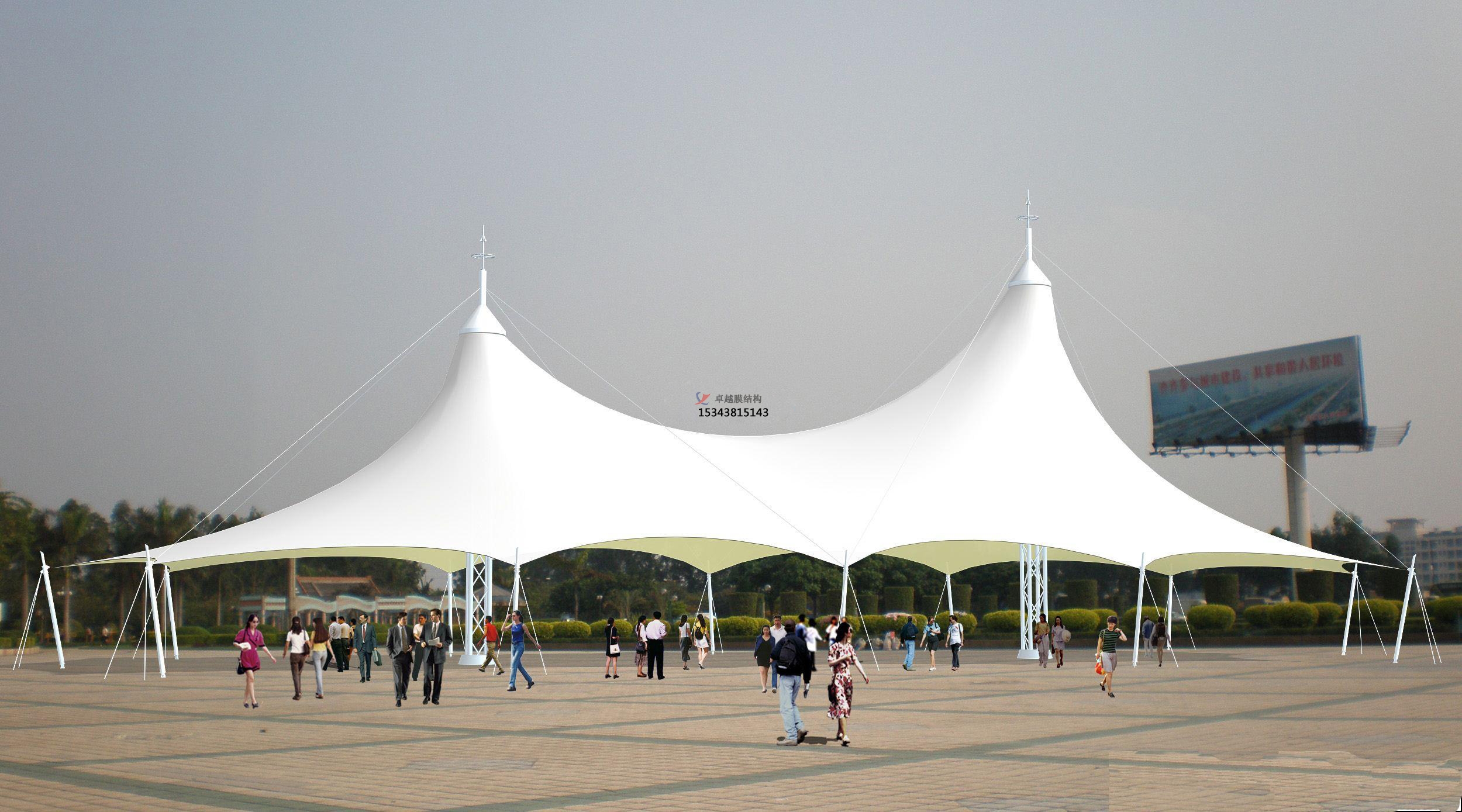 膜結(jié)構(gòu)景觀是建筑結(jié)構(gòu)中更新發(fā)展起來的一種形式,它以性能優(yōu)良的織物為材料,或是向膜內(nèi)充氣,由空氣壓力支撐膜面,或是利用柔性鋼索或剛性支撐結(jié)構(gòu)將面繃緊,從而形成具有一定剛度、能夠覆蓋大跨度空間的結(jié)構(gòu)體系。自從上世紀(jì)七十年代以來,膜結(jié)構(gòu)景觀在國外已逐漸應(yīng)用于體育建筑、商場、展覽中心、交通服務(wù)設(shè)施等大跨度建筑中。膜結(jié)構(gòu)景觀已成為結(jié)構(gòu)設(shè)計(jì)選型中的一個(gè)主要方案。