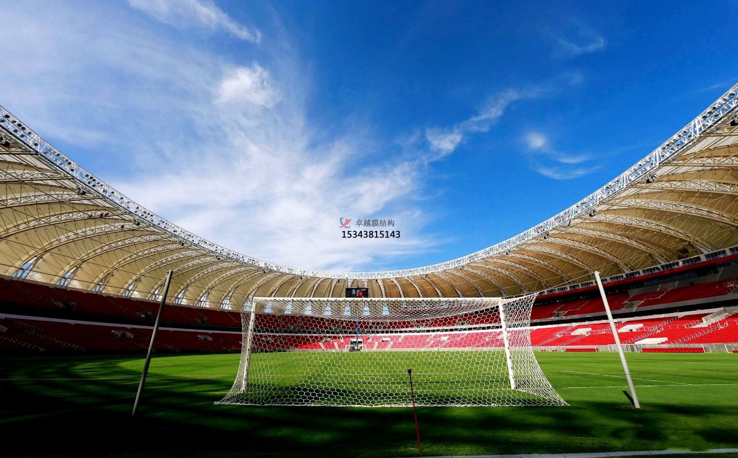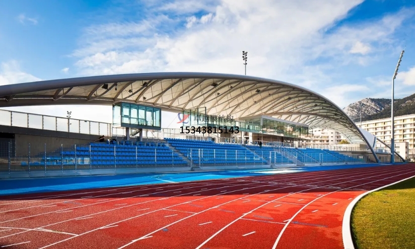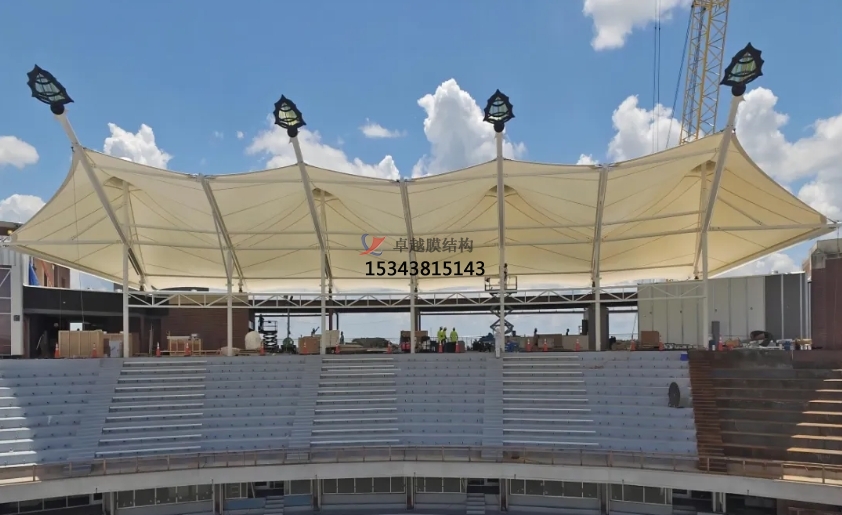 膜結(jié)構(gòu)體育看臺(tái)是以高強(qiáng)度柔性薄膜材料(如ETFE、PTFE、PVDF等)為覆蓋層,通過(guò)鋼索、鋼結(jié)構(gòu)框架或張力系統(tǒng)形成預(yù)張應(yīng)力空間結(jié)構(gòu)的建筑形式24。其設(shè)計(jì)融合建筑力學(xué)與材料科技,既能實(shí)現(xiàn)大跨度無(wú)柱懸挑,又能塑造流線型外觀,滿足體育場(chǎng)館寬視野、低荷載的建造需求。