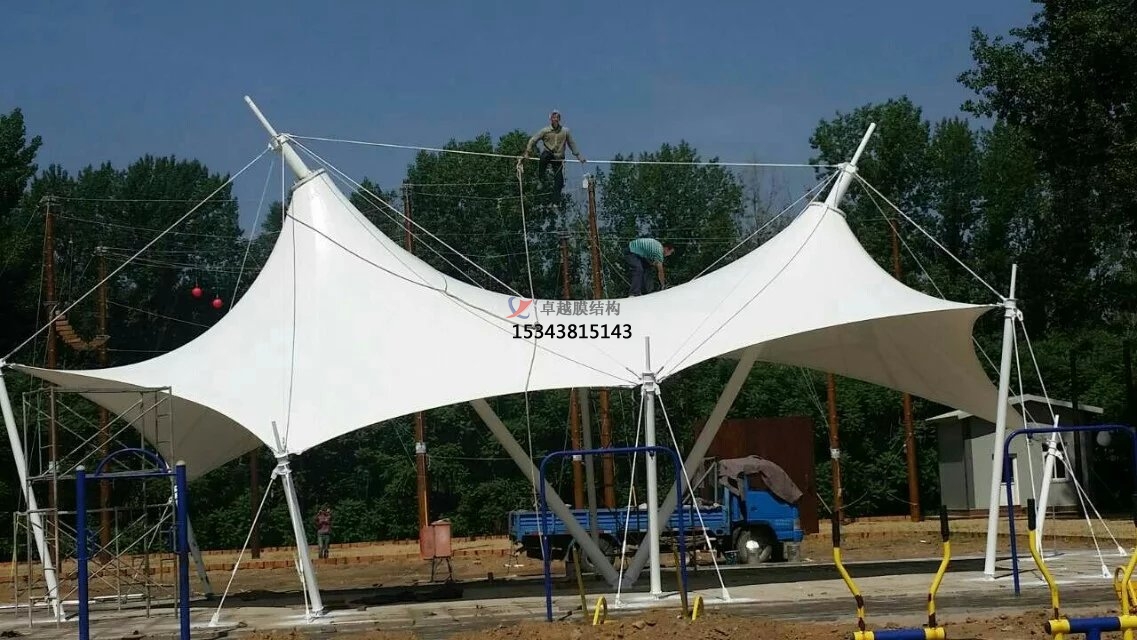 膜結(jié)構(gòu)遮陽(yáng)棚結(jié)構(gòu)設(shè)計(jì):其結(jié)構(gòu)設(shè)計(jì)主要從找形分析、荷載計(jì)算、支撐體系、形態(tài)創(chuàng)新、膜材選擇等方面出發(fā)。找形分析,通過力密度法、動(dòng)力松弛法或非線性有限元法確定膜材空間形態(tài),確保合理受力分布與美學(xué)效果。荷載計(jì)算,重點(diǎn)考慮風(fēng)荷載、雪荷載及自重,采用有限元法進(jìn)行靜力與動(dòng)力分析,避免膜面受壓或局部應(yīng)力集中。支撐體系,選擇合適的支撐結(jié)構(gòu)形式,如鋼結(jié)構(gòu)、鋁合金結(jié)構(gòu)等。支撐結(jié)構(gòu)應(yīng)具有足夠的強(qiáng)度、剛度和穩(wěn)定性,能夠可靠地承受膜面?zhèn)鱽淼暮奢d。常見的支撐方式有立柱支撐、懸索支撐、框架支撐等。形態(tài)創(chuàng)新,結(jié)合曲線、弧線等元素,設(shè)計(jì)可調(diào)節(jié)遮陽(yáng)棚,適應(yīng)不同光照與使用需求。半透明膜材與光影結(jié)合,營(yíng)造柔和氛圍,兼具遮陽(yáng)與景觀功能。膜材選擇,根據(jù)遮陽(yáng)棚的使用要求和環(huán)境條件,選擇合適的膜材。膜材應(yīng)具有良好的耐久性、抗紫外線性能、自潔性能、防火性能等。常用的膜材有聚四氟乙烯(PTFE)膜、聚酯纖維基 PVC 膜、乙烯 - 四氟乙烯共聚物(ETFE)膜等。