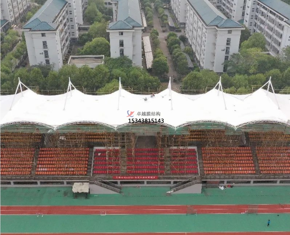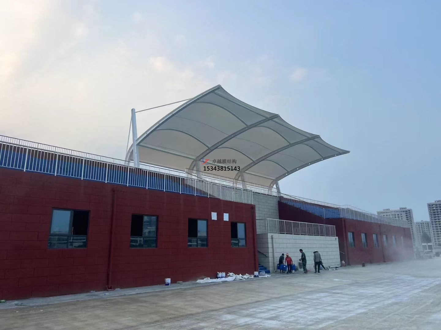 膜結構在體育設施上主要應用在學校操場運動看臺或主席臺屋頂,另外大型體育場館看臺膜結構屋頂也屢見不鮮。一般看臺造型都是由貝殼形峰膜及端部張拉膜組成,形式新穎活潑。鋼架、索、膜巧妙結合,通過薄膜、膜邊索、脊索、谷索、拉索、拉桿及一定的格構梁來穩(wěn)定。膜頂平滑過渡,結構美觀、輕巧、整體造型相互輝映,別具一格。