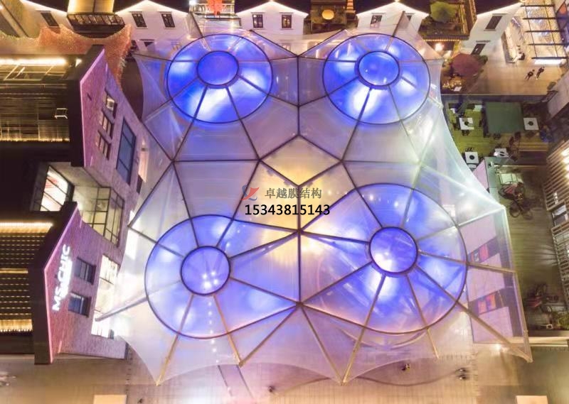 膜結(jié)構(gòu)的曲面造型與半透明特性,可模擬四季光影變幻,如某項目通過投影技術(shù)在天幕呈現(xiàn)沉浸式星空、森林等主題場景,成為網(wǎng)紅打卡地。