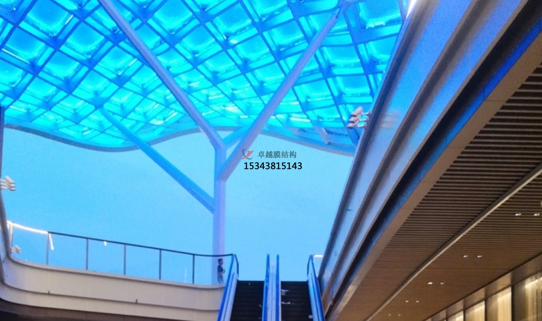 膜結(jié)構(gòu)以高強度柔性薄膜(如ETFE、PVDF)為核心材料,結(jié)合鋼索、桁架等支撐體系,形成兼具輕量化與高穩(wěn)定性的空間曲面12。其自重僅為傳統(tǒng)鋼構(gòu)的1/3,大幅降低基礎(chǔ)造價,同時支持50米以上無柱大跨度設(shè)計,為商業(yè)廣場創(chuàng)造開闊通透的公共空間。ETFE氣枕膜通過多層鍍點設(shè)計,可智能調(diào)節(jié)透光率與紫外線過濾效率,例如嘉興長安里商業(yè)街的天幕結(jié)構(gòu),既能實現(xiàn)光線漫射營造柔和氛圍,又能有效阻隔70%以上的紫外線輻射。