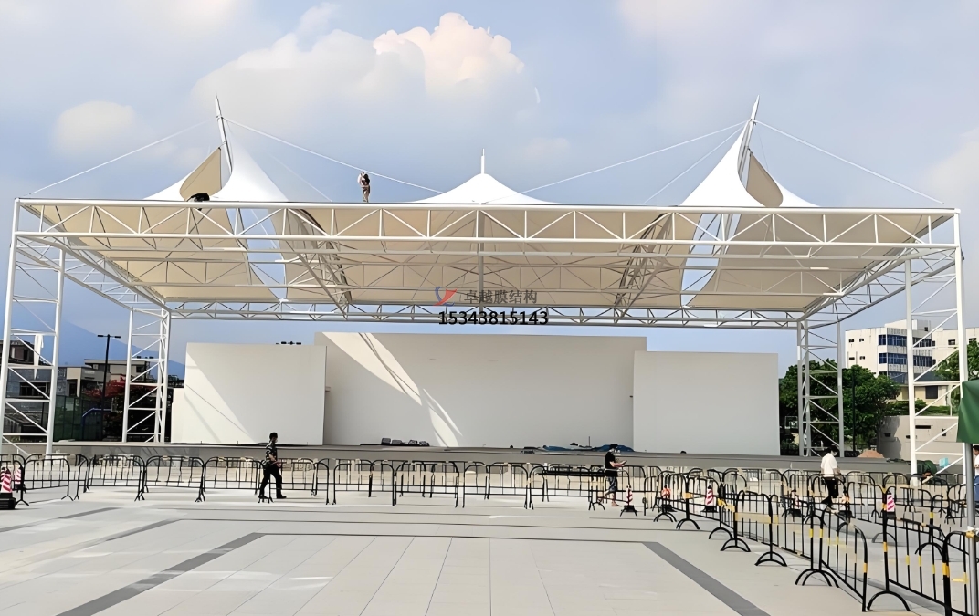 舞臺膜結構更加輕盈,便于運輸和安裝。同時,其模塊化設計使得搭建過程更加靈活高效,能夠快速適應不同場地和表演需求,降低了搭建成本和時間成本。這種靈活性使得舞臺膜結構成為戶外音樂節(jié)、大型演唱會等活動的首選,為藝術家和觀眾提供了更加廣闊的創(chuàng)意和想象空間。