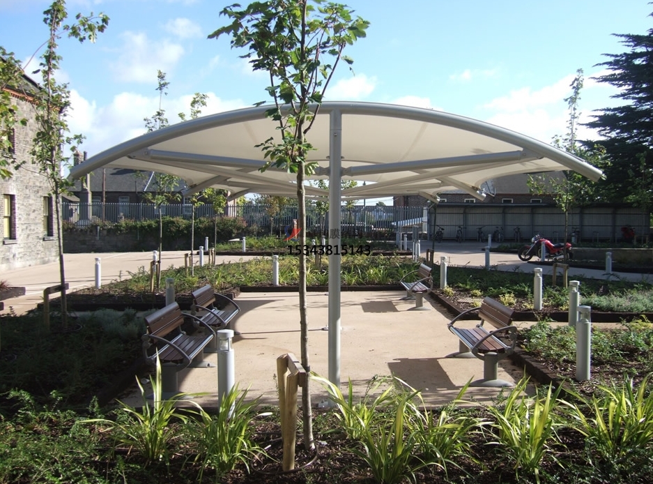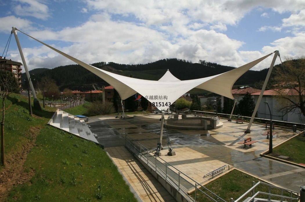 遮陽與擋雨:在戶外公共空間中,景觀膜結(jié)構(gòu)常被用作遮陽篷、雨篷或涼亭,為游客提供舒適的休憩環(huán)境。其大跨度的設(shè)計能夠覆蓋較大的區(qū)域,滿足不同天氣條件下的使用需求。