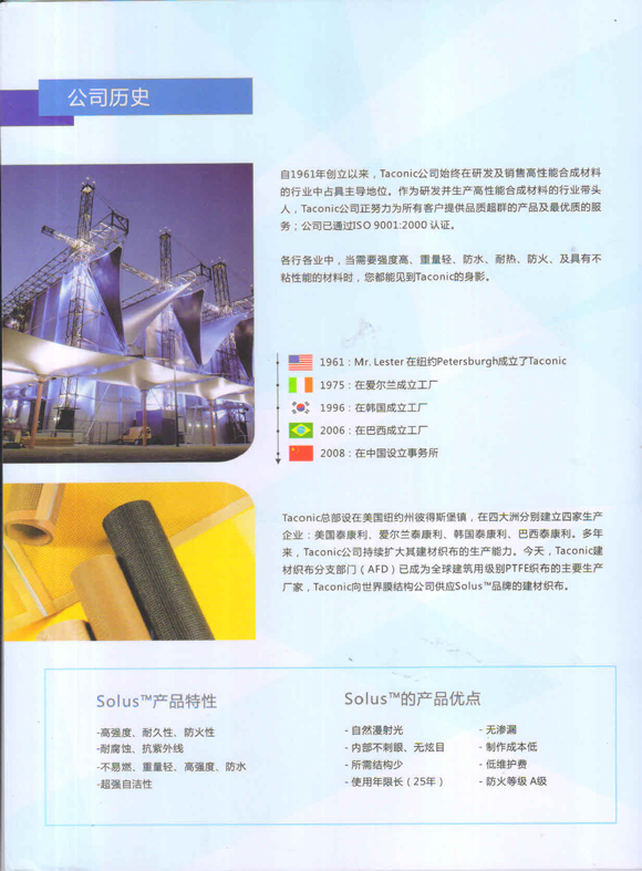 十多年來(lái),Taconic公司持續(xù)地?cái)U(kuò) 大了其建材織布的生產(chǎn)能力。今天,Taconic的建 材織布分支部門(mén)](AFD)已成為全球建筑用級(jí)別PTFE /織布的主要生產(chǎn)廠家,Taconic向全世界織布結(jié)構(gòu)公司供應(yīng)Solus 品牌的建材織布。借助于我們?cè)跉W洲,美洲和亞洲的產(chǎn)業(yè)基地,Taconic/AFD 通過(guò)其分布各地的加工,銷(xiāo)售和服務(wù)網(wǎng)絡(luò)向全球客戶群供應(yīng)優(yōu)質(zhì)服務(wù)。
