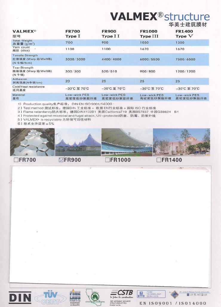 德國米樂膜材的獨特性能:雙面PVDF自潔涂層-不僅對膜材頂面有更好的的保護(hù)作用,而且對底面也有優(yōu)良的保護(hù)作用。完全消除了僅有一面PVDF涂層的膜材缺點,和因此而帶來的工程隱患。使其更加適合品質(zhì)要求較高的大型、永久性、標(biāo)志性建筑。