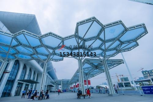 項目概況:項目設(shè)計成倒喇叭形狀,采高度21米,外挑9米,采用PTFE膜材,展開面積7400平米。