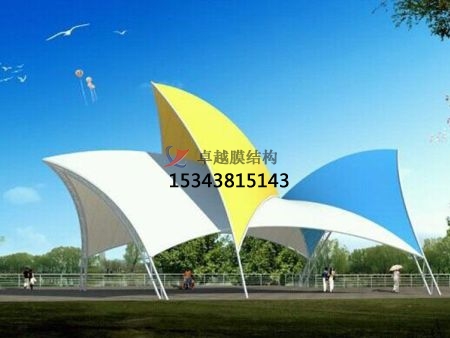 膜結(jié)構(gòu)景觀一般分PVC、PTFE和ETFE膜三大類。PVC膜是以聚酯纖維作基材,覆以PVC形成的;PTFE膜材的基材是玻璃纖維;而ETFE膜則是沒(méi)有基材,直接成膜。