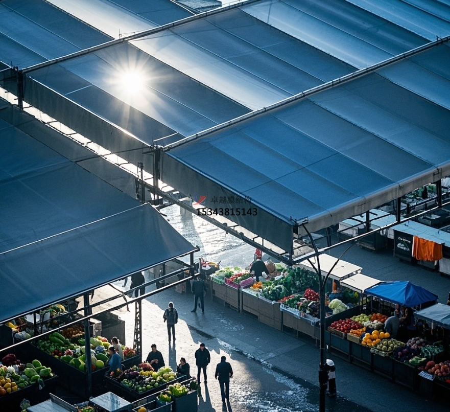 城市中心傳統(tǒng)農(nóng)貿(mào)市場(chǎng)改造:在城市核心區(qū)域,土地資源緊張,傳統(tǒng)農(nóng)貿(mào)市場(chǎng)設(shè)施陳舊、空間局促。膜結(jié)構(gòu)改造方案通過(guò)拆除原有老舊頂棚,搭建輕巧、美觀的膜結(jié)構(gòu)頂棚,能在不增加過(guò)多占地面積的情況下,優(yōu)化市場(chǎng)空間,提升采光、通風(fēng)效果,改善購(gòu)物環(huán)境,同時(shí)保留傳統(tǒng)市場(chǎng)的煙火氣,讓城市記憶與現(xiàn)代功能完美融合,如北京的部分老城區(qū)農(nóng)貿(mào)市場(chǎng)改造項(xiàng)目,就借助膜結(jié)構(gòu)實(shí)現(xiàn)了華麗轉(zhuǎn)身,重新煥發(fā)生機(jī)。