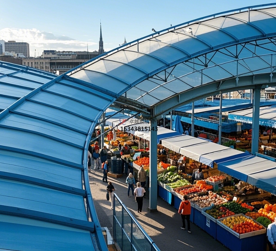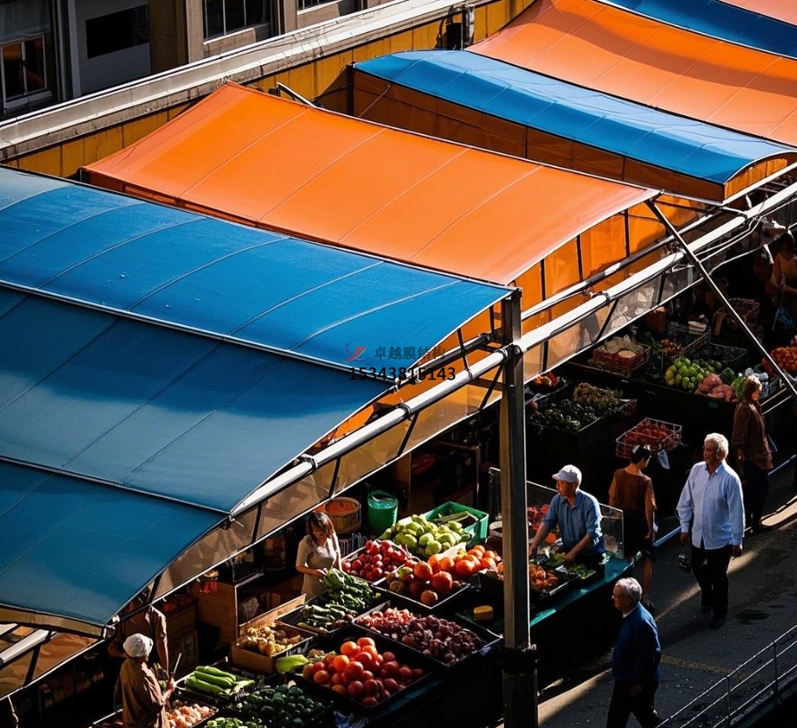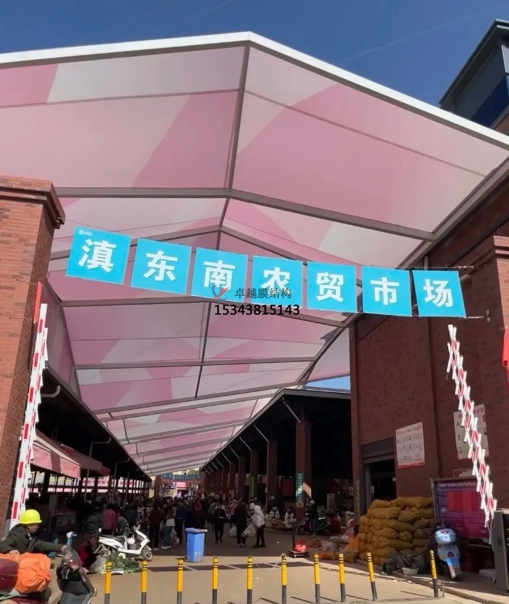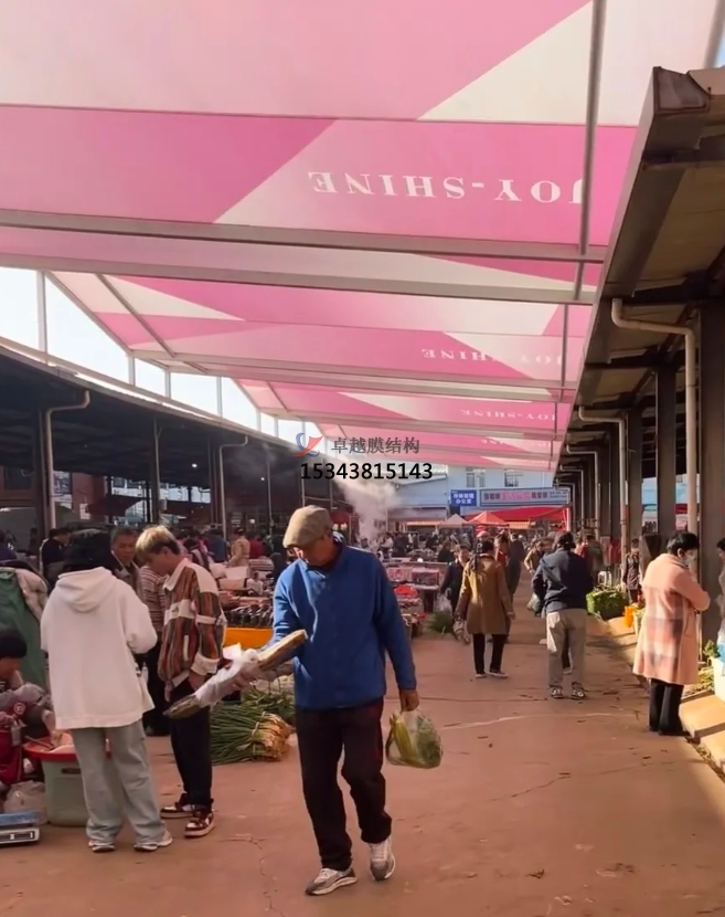 美觀與個(gè)性化彰顯:膜結(jié)構(gòu)設(shè)計(jì)極具創(chuàng)意,能依據(jù)農(nóng)貿(mào)市場(chǎng)所在區(qū)域的文化特色、建筑風(fēng)格,定制獨(dú)特造型與色彩?;蛉珈`動(dòng)的波浪,或似展翅的飛鳥,為傳統(tǒng)農(nóng)貿(mào)市場(chǎng)注入現(xiàn)代時(shí)尚元素,提升市場(chǎng)整體形象與辨識(shí)度。鮮明的色彩搭配,不僅能吸引消費(fèi)者目光,還能為市場(chǎng)營(yíng)造活潑、熱鬧的氛圍,讓農(nóng)貿(mào)市場(chǎng)成為城市中一道獨(dú)特的人文景觀,成為居民休閑購(gòu)物的好去處,帶動(dòng)周邊商業(yè)活力。