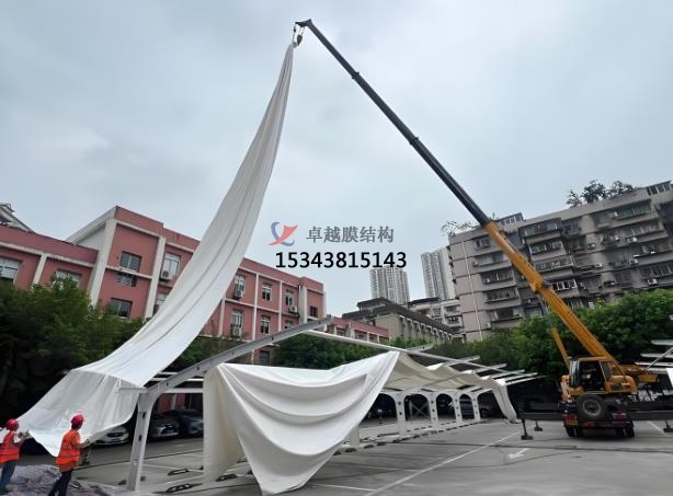 安裝過程:安裝過程分別是鋼結(jié)構(gòu)的安裝,膜材的安裝和附件安裝。鋼結(jié)構(gòu)的安裝會根據(jù)設(shè)計要求進行鋼結(jié)構(gòu)基礎(chǔ)的施工,確?;A(chǔ)的尺寸、位置、標(biāo)高符合設(shè)計要求,做到表面光滑、無變形、無損傷。鋼結(jié)構(gòu)的安裝位置必須準(zhǔn)確,將鋼結(jié)構(gòu)構(gòu)件在地面進行預(yù)組裝,檢查各構(gòu)件的連接是否準(zhǔn)確、牢固,使用專業(yè)的吊裝設(shè)備,如起重機等,按照預(yù)定的吊裝方案進行操作,確保鋼結(jié)構(gòu)的安裝位置準(zhǔn)確。要隨時進行測量和調(diào)整,保證鋼結(jié)構(gòu)的垂直度、水平度和跨度等符合設(shè)計要求。采用焊接、螺栓連接等方式將鋼結(jié)構(gòu)構(gòu)件連接固定,確保連接的強度和可靠性。焊接時,要嚴(yán)格控制焊接質(zhì)量,避免出現(xiàn)焊接缺陷。膜材的安裝過程,膜面的尺寸和形狀必須符合設(shè)計要求,表面干凈、無損傷。膜材在安裝現(xiàn)場按照預(yù)定的方向和位置展開,同時應(yīng)注意避免膜材與地面或其他物體摩擦、劃傷。使用專用的夾具或繩索將膜材固定在鋼結(jié)構(gòu)上,初步調(diào)整膜材的位置,使其與鋼結(jié)構(gòu)的連接點對齊。進行逐步且均衡的膜面張拉,張拉過程要均勻、緩慢地進行,施加適當(dāng)?shù)念A(yù)張力,同時要根據(jù)膜材的實際情況,對張拉力進行適當(dāng)?shù)恼{(diào)整,保證膜材表面平整、光滑,無褶皺、松弛等現(xiàn)象,使其達到設(shè)計要求。在膜材張拉到位后,使用專用的固定件將膜材牢固地固定在鋼結(jié)構(gòu)上。固定件的間距和安裝方式要符合設(shè)計要求,確保膜材在使用過程中不會出現(xiàn)松動或位移。附件安裝,附件的安裝包括排水系統(tǒng)安裝,遮陽設(shè)施安裝和安全設(shè)施安裝。安裝膜結(jié)構(gòu)的排水槽、落水口等排水設(shè)施,確保雨水能夠順利排出,避免在膜面形成積水。排水系統(tǒng)的安裝要保證密封性和排水順暢性。如果膜結(jié)構(gòu)設(shè)計有遮陽要求,安裝相應(yīng)的遮陽簾、遮陽網(wǎng)等遮陽設(shè)施。遮陽設(shè)施的安裝要牢固可靠,能夠滿足遮陽和使用功能的要求。安裝必要的安全設(shè)施,如欄桿、安全網(wǎng)等,確保人員在膜結(jié)構(gòu)區(qū)域內(nèi)的安全。