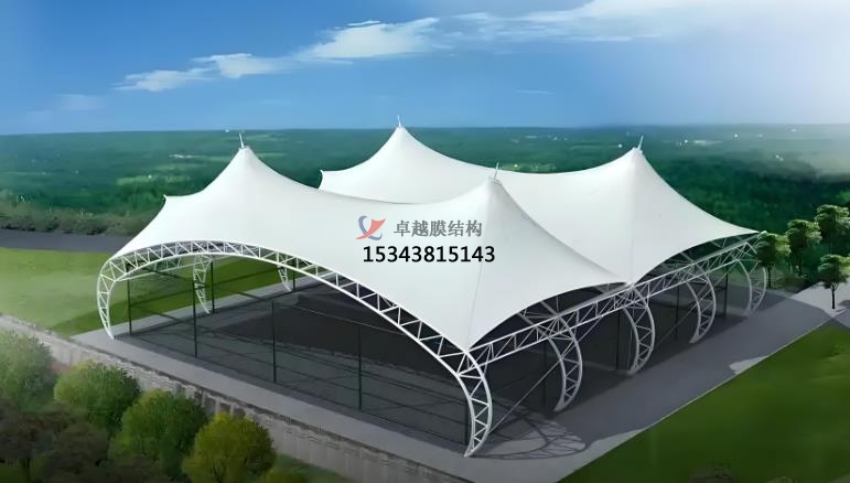三 膜結(jié)構(gòu)雨棚的應(yīng)用領(lǐng)域:商業(yè)領(lǐng)域,交通領(lǐng)域,體育領(lǐng)域,景觀領(lǐng)域。商業(yè)領(lǐng)域,商場、購物中心、商業(yè)街等的入口、廣場、停車場等位置,可提供遮陽避雨的空間,同時增加空間利用率,其新穎的造型設(shè)計(jì)成為景觀亮點(diǎn)可吸引顧客,提升商業(yè)氛圍。交通領(lǐng)域,在機(jī)場、火車站的候車廳,高速公路服務(wù)區(qū)、收費(fèi)站、公交站臺等地方,能為旅客提供舒適的候車環(huán)境。體育領(lǐng)域,大型體育館以及體育看臺常采用膜結(jié)構(gòu)雨棚,其大跨度特性可滿足視野寬闊無結(jié)構(gòu)遮擋的要求,且膜材透光性可使白天室內(nèi)達(dá)到和室外幾乎一樣的自然效果,體育館、體育場、游泳館等體育場館的入口、看臺、休息區(qū)等,可保護(hù)觀眾和運(yùn)動員免受風(fēng)雨侵襲,增強(qiáng)場館的整體美觀度。景觀領(lǐng)域,公園、廣場、花園、景區(qū)等地方,作為景觀小品或休息設(shè)施,為人們提供休息、觀賞的空間,與自然環(huán)境相融合,增添景觀的現(xiàn)代感,膜結(jié)構(gòu)雨棚與周圍環(huán)境融為一體可創(chuàng)造出浪漫溫馨的空間,在夜間彩燈映射下形成絢麗繽紛的景觀。工業(yè)領(lǐng)域,膜結(jié)構(gòu)廠房具有結(jié)構(gòu)輕便、抗震性好等特點(diǎn),廣泛應(yīng)用于各類工廠,也可用于一些倉庫、污水處理設(shè)施等的覆蓋。