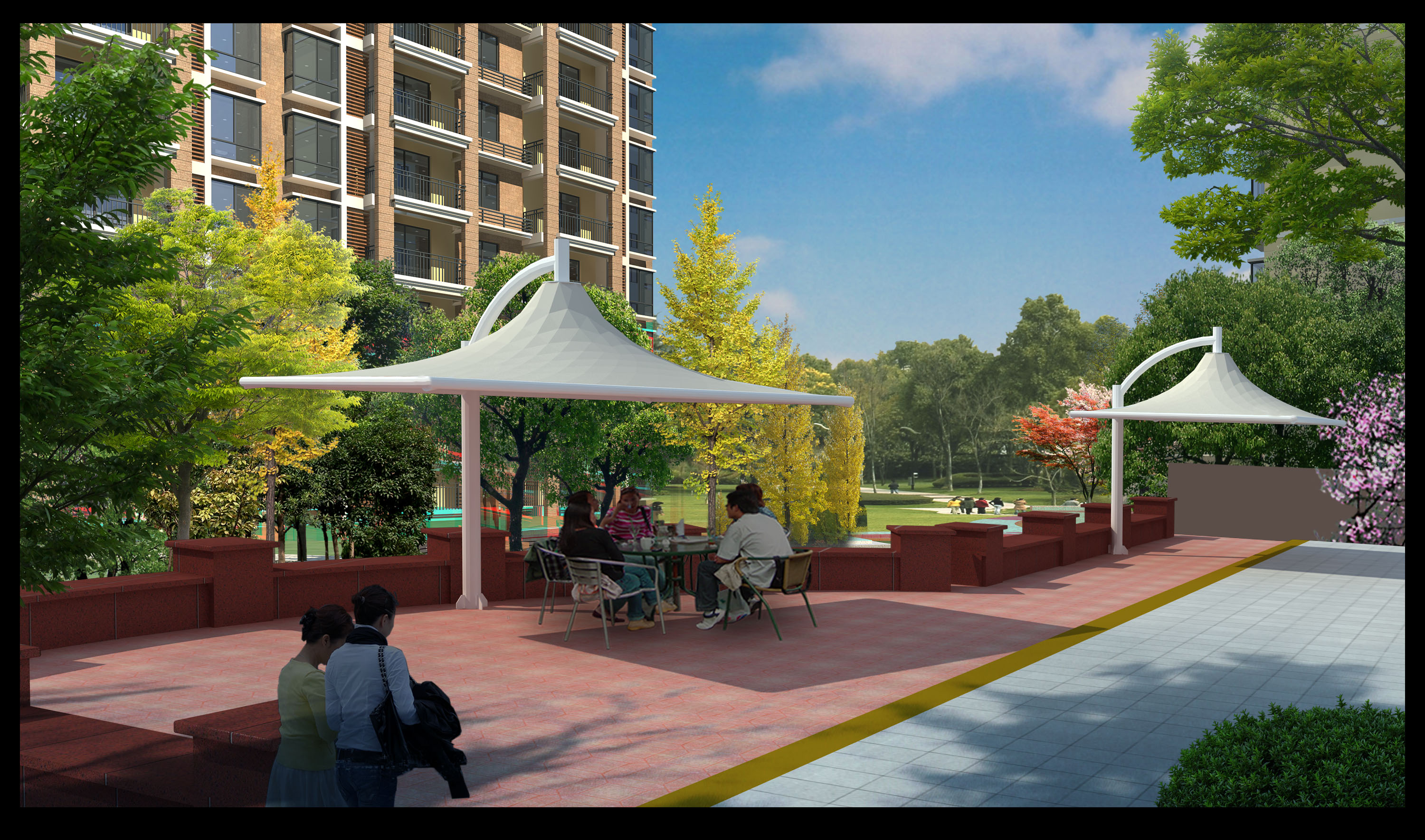 由于膜結構景觀棚造型結構的自身特性,其可以滿足從簡單遮陽結構到功能復雜的大型建筑等許多不同的建筑功能要求,并形態(tài)極具表現(xiàn)力且對于有些功能要求只有它才是更為適合的。具有特定功能的建筑都可通過立意得以表達,膜結構景觀棚獨特造型體現(xiàn)了建筑自身的自然美感。
