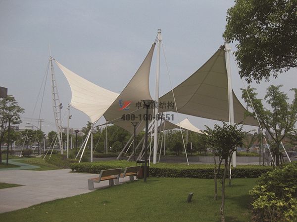 6、這是膜結構景觀工程的案例,膜結構所用的膜材本身具有良好的透光率,建筑空間白天可得到自然的漫射光,能節(jié)約大量照明能源;相對于傳統涂理PVC的聚醋纖維膜材,涂覆PTFE的玻瑞纖維膜材的透射光譜更加均勻具有外觀新穎,經濟適用,適用壽命長,結構更安全,質量更可靠。