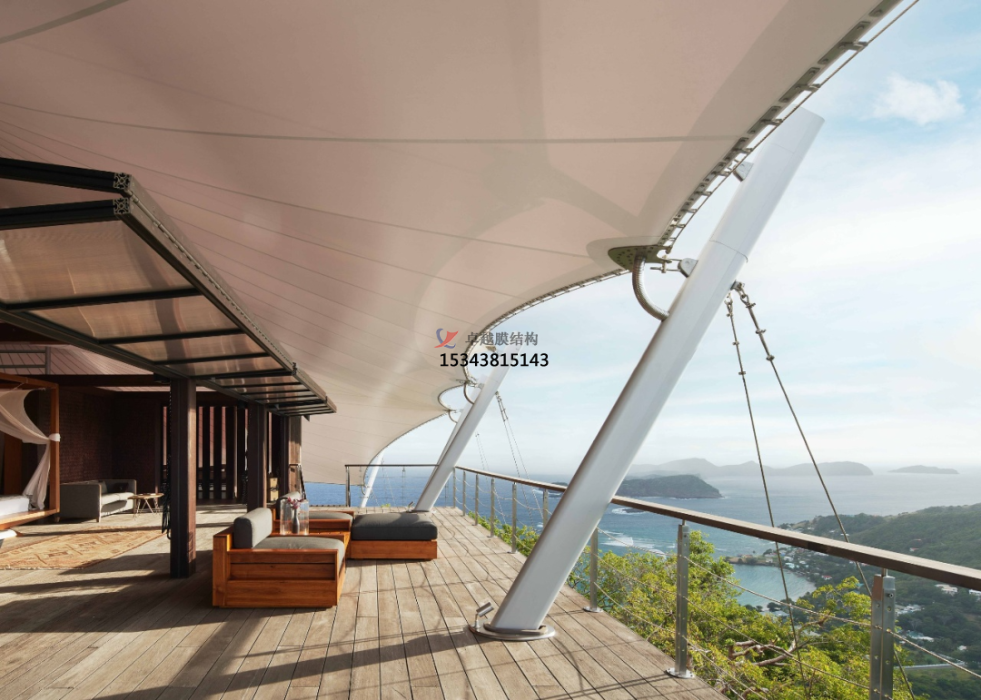 1.張拉膜結(jié)構(gòu):以膜材、鋼索及支柱構(gòu)成,利用鋼索與支柱在膜材中導入張力以達安定的形式,是最能展現(xiàn)膜結(jié)構(gòu)精神的構(gòu)造形式。