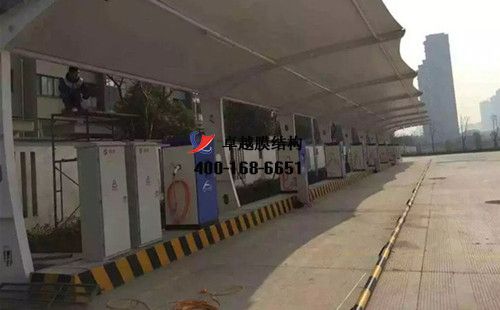 膜結構充電站樁車棚設計、施工案例,我們在信陽承接了信陽市公共交通總公司、信陽市德正新能源有限公司、信陽市汽車站