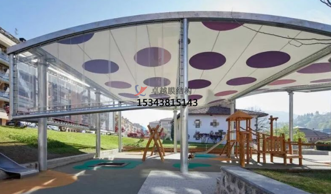 兒童游樂場所本就是趣致可愛的,迎合孩子們的喜好,配套遮陽設施的建設也應該考慮在內(nèi),下面兩個遮陽項目屬于同一系列,波點圖案,活潑的色調(diào),再加上起伏的造型,讓人感覺輕松愉快。兩個項目都采用PVC+ETFE膜材。