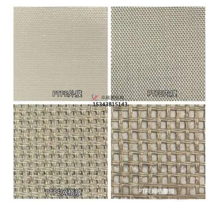 PTFE網(wǎng)格膜,基材紗線編織間距很大,涂層不再是滿覆,形成一定的開孔率(20~70%)。特點(diǎn)是透光率高(30~70%,透光透景)、裝飾遮陽(yáng)效果好;強(qiáng)度低于外膜、透氣透水、不吸音。