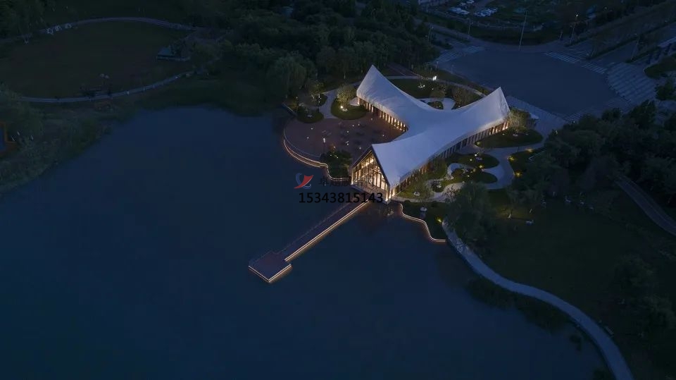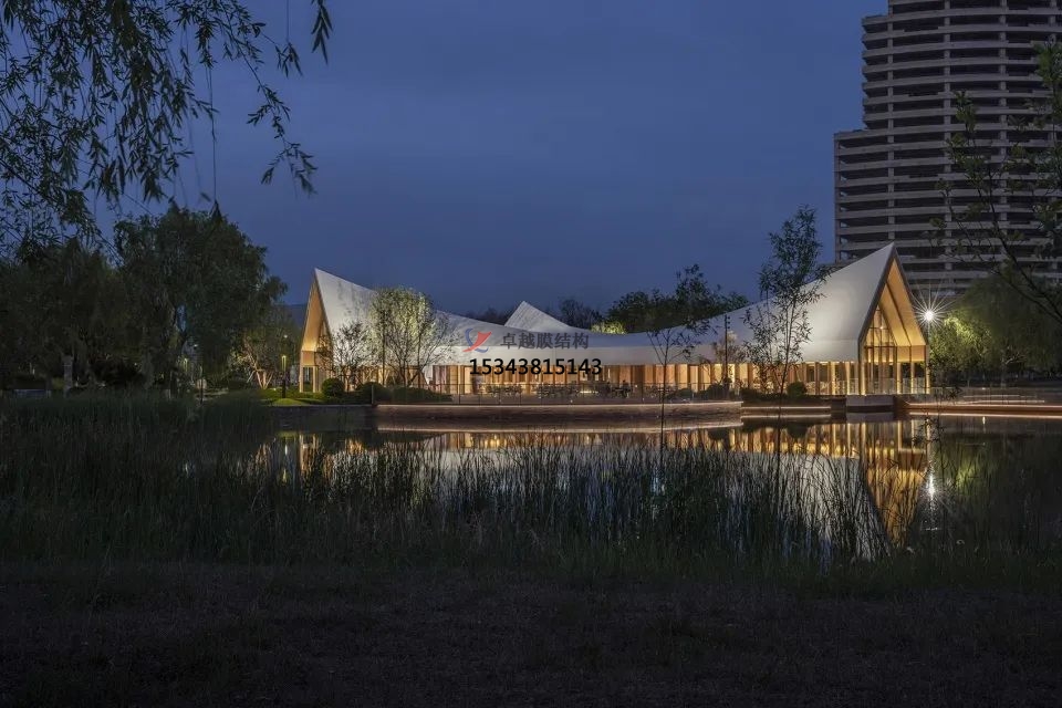 設(shè)計(jì)采用了新型鋼木組合結(jié)構(gòu),工廠預(yù)制,建造便捷,縮短工期。屋頂使用的是白色PVDF膜材,通過(guò)張拉性能實(shí)現(xiàn)三維屋面造型,勾勒出流暢的屋脊線,強(qiáng)化建筑簡(jiǎn)潔、干凈的形體美感。