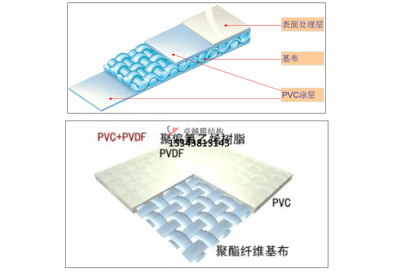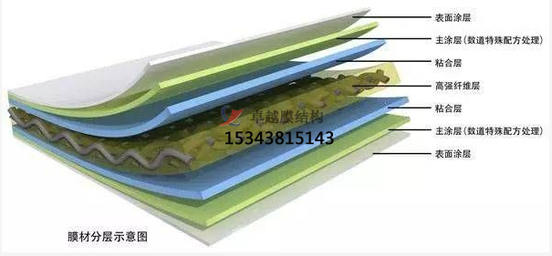 PVDF膜材加工是在聚酯纖維基布上涂上Pv(聚氬乙烯)樹(shù)酯后加上100%PVDF(聚偏氟乙烯)表面涂層而成的復(fù)合材料。PVDF膜權(quán)由于自潔性良好、價(jià)格適中、運(yùn)輸安裝方使,更廠泛應(yīng)用于各類建筑領(lǐng)域。它的壽命因不同的表面涂層而異,一股可達(dá)成10-25年,其構(gòu)造形式見(jiàn)下圖:
