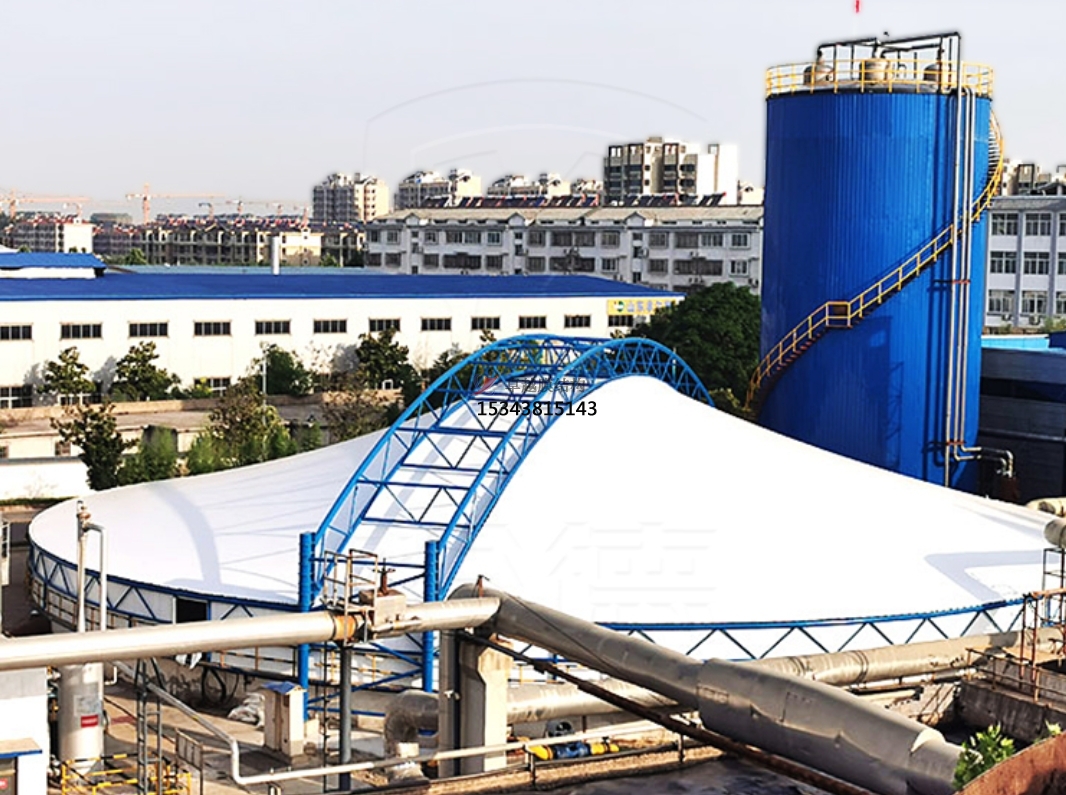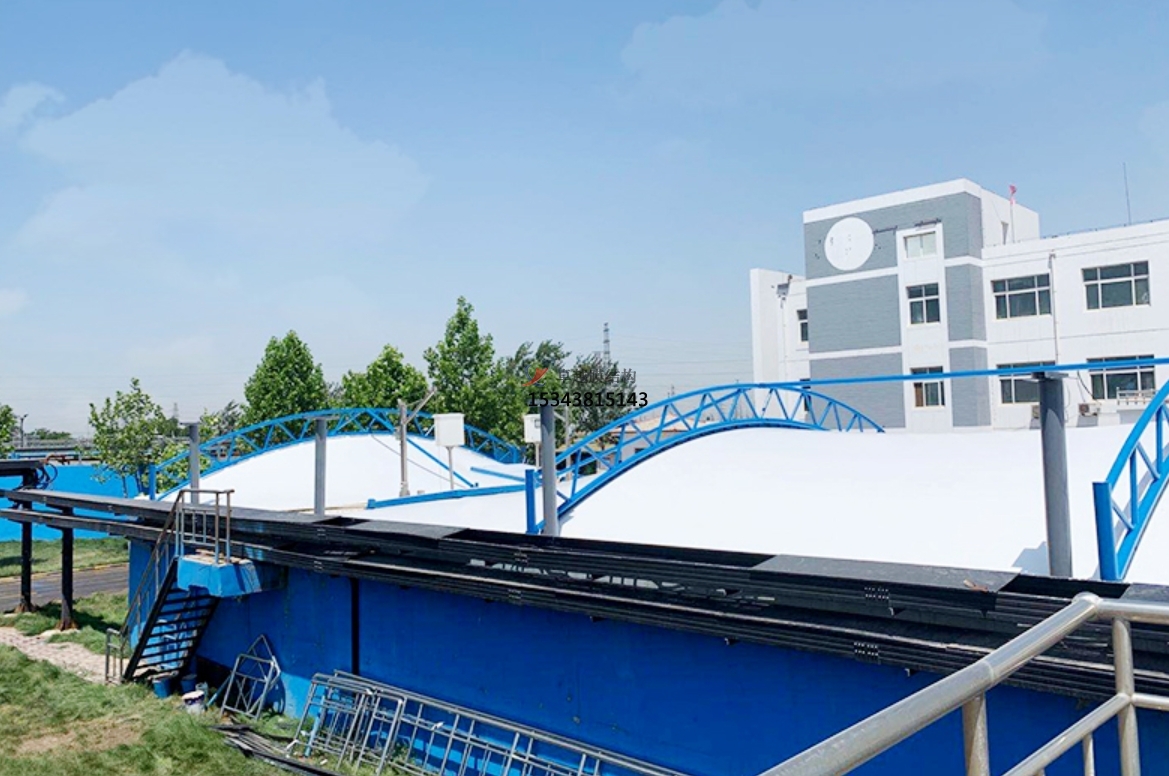 污水池反吊膜技術是一種利用膜材反吊的原理,將鋼結構在外將膜材懸吊,利用膜材的氣密性特點,將廢氣密封在一個密閉的空間,進而將凈化后的廢氣排出池外,達到排放標準的技術。它采用以鋼構為支撐,膜材反吊覆蓋的膜結構形式,即抗腐蝕能力很強的新型環(huán)保膜材將廢氣量住,而鋼結構則在外面將膜懸吊起來。