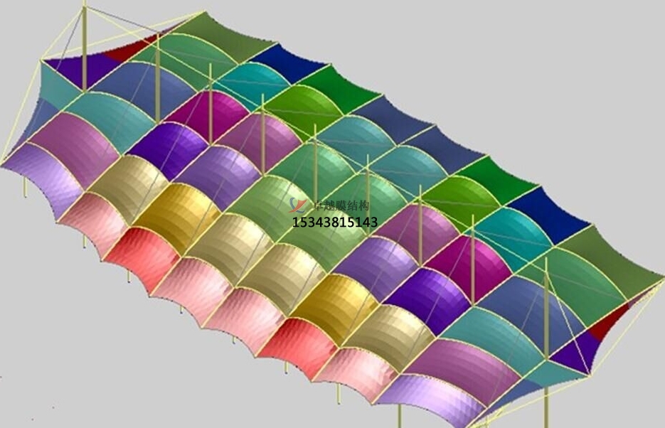 索膜結(jié)構(gòu)和膜結(jié)構(gòu)的核心構(gòu)成:索膜解構(gòu)是由索網(wǎng)系統(tǒng)和膜材構(gòu)成的,膜結(jié)構(gòu)是由膜材和支撐體系構(gòu)成。在索膜解構(gòu)中,索網(wǎng)系統(tǒng)承擔(dān)主要的拉力,通過張拉形成穩(wěn)定的幾何形狀(如馬鞍形、傘形等),是結(jié)構(gòu)的 “骨架”,由膜材覆蓋在索網(wǎng)上,除了承受自身荷載外,還與索網(wǎng)共同抵抗外部荷載(如風(fēng)、雪)。索網(wǎng)的存在使結(jié)構(gòu)剛度更高,可跨越更大跨度,形態(tài)更靈活,常用于需要復(fù)雜曲面或大空間的場景。在膜結(jié)構(gòu)中,膜材是主要材料,多為高分子復(fù)合材料(如PVDF膜、PTFE膜),依賴自身張力或外部支撐保持形態(tài)。支撐體系包括骨架(如鋼結(jié)構(gòu)、鋁合金框架)、桅桿、拉索等,但膜材是受力主體。特點能更強調(diào)膜材的獨立性,支撐體系相對簡單,結(jié)構(gòu)形式更輕量化,適用于中小型跨度或?qū)υ煨陀刑厥庖蟮膱鼍啊?br />