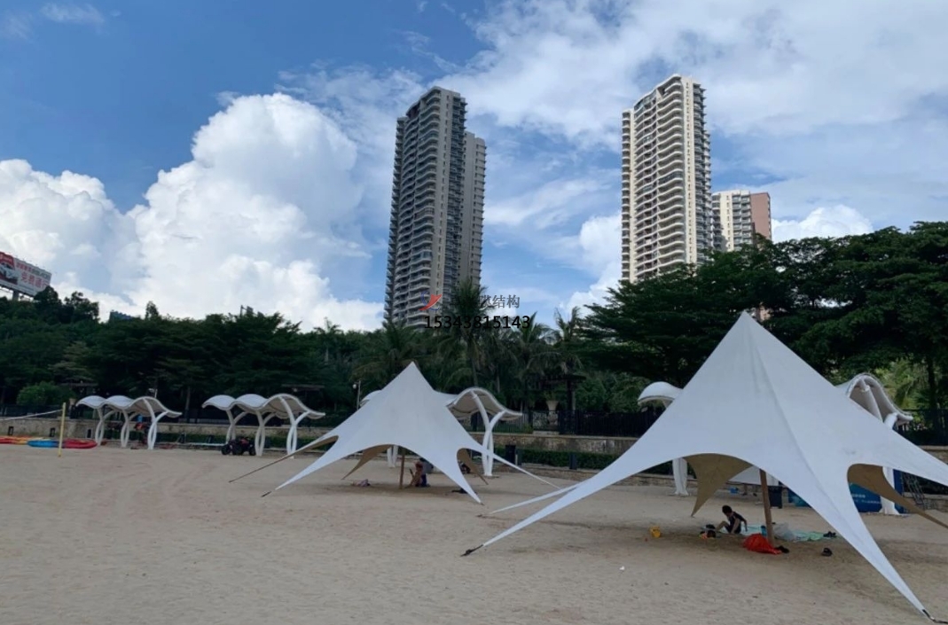 景觀棚膜結(jié)構(gòu)最大的特點(diǎn)之一就是其幾乎不受限制的造型能力。設(shè)計(jì)師可以根據(jù)不同的場地需求、文化背景以及功能要求,創(chuàng)造出如貝殼般優(yōu)雅的曲線、如帆船般靈動(dòng)的輪廓、如花朵般綻放的形態(tài)等等。這種獨(dú)特的造型不僅能夠成為視覺上的焦點(diǎn),提升整個(gè)區(qū)域的景觀品質(zhì),還能很好地與周圍的自然環(huán)境或建筑風(fēng)格相融合,形成和諧統(tǒng)一的整體畫面。