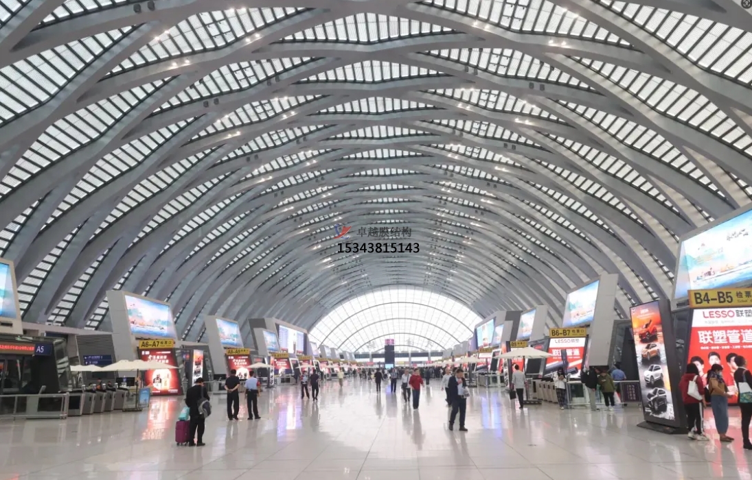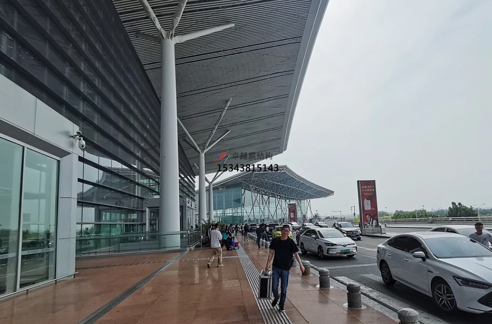 機(jī)場膜結(jié)構(gòu)多用于機(jī)場航站樓的雨棚、采光帶、室內(nèi)吊頂?shù)染植课恢?,為機(jī)場建筑增添現(xiàn)代感和藝術(shù)氣息。