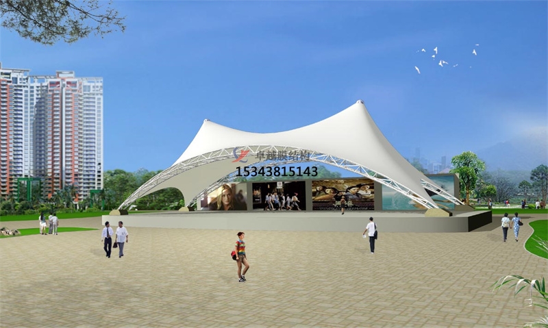 二、舞臺膜結構造型獨特:所用膜材是柔性材料、整體造型更容易實現(xiàn)獨特性,我們可以為客戶做多個造型方案由客戶選擇,定制化的流程可以保證舞臺自由空間曲面多變化。
