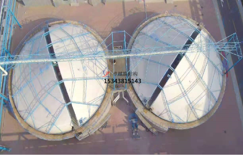 雙膜密封罩結(jié)構(gòu)是污水池上加蓋的一個氣囊,它由上下兩層氟碳纖維膜焊接而成,通過周邊與污水池池壁錨固,形成一個穩(wěn)定的受力結(jié)構(gòu),起到污水池內(nèi)惡臭氣體密閉的效果。雙膜密封罩結(jié)構(gòu)的優(yōu)點(diǎn)是結(jié)構(gòu)牢固、密封性好、防止水溫升高或降低,適用于工業(yè)水曝氣池或市政污水池。