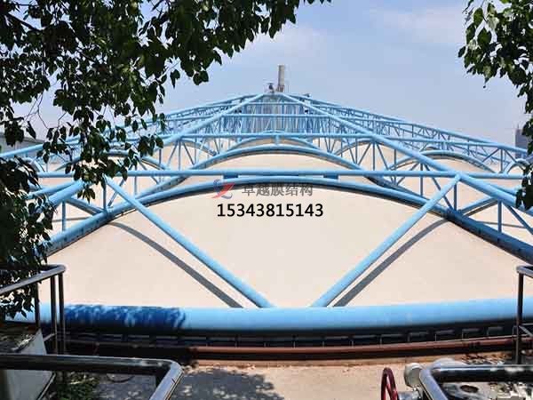 2、我公司利用膜結構的輕巧,別致的造型建造各種半封閉,全封閉的不行空間;污水池反吊膜結構中的高強度柔韌薄膜稱膜材,它是一種耐腐蝕、耐高溫、耐久用、高強度的樹脂類涂層織物,由多種復合PVC樹脂涂層刀刮成型,具有質地柔韌、厚度小、重量輕、透光性好的特點。對自然光吸收和透射能力、阻燃,具有良好的耐久、防火、氣密等特性;表面經(jīng)過特氟龍?zhí)幚砘蚨趸伩估匣幚?,具有較高的自清潔性能。下面就大家介紹一下我公司在泰安市地區(qū)完成的部分污水池膜結構封閉項目。
