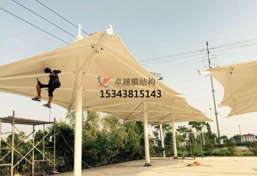 第三步:景觀膜結構遮陽棚懸掛臂時的安裝焊接工作,在做懸掛臂安裝采用焊接,檢查焊接節(jié)點檢查確認懸掛臂設計坡度,檢查準確無誤后開始焊接。