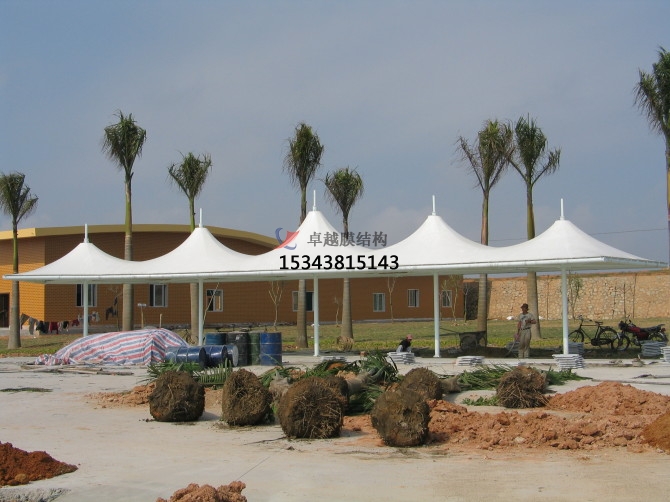 某看臺工程采用張拉膜景觀,形式新穎、活潑。鋼架與索和膜合理結(jié)合,膜頂平滑過渡,結(jié)構(gòu)美觀、輕巧、整體造型相互輝映,自具一格。以下介紹的是該張拉膜景觀工程的設(shè)計(jì)步驟及準(zhǔn)則,為以后工程的設(shè)計(jì)提供了參考。