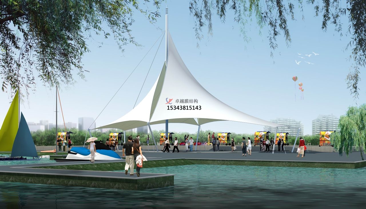 6、景觀設(shè)施:膜結(jié)構(gòu)以其特殊的建筑表現(xiàn)手法,主要體現(xiàn)在造型、漫射透光性、豐富多彩,可廣泛應(yīng)用于入口、標(biāo)志性小品 、步行街、停車場等,其他建筑特性無須較高要求。
